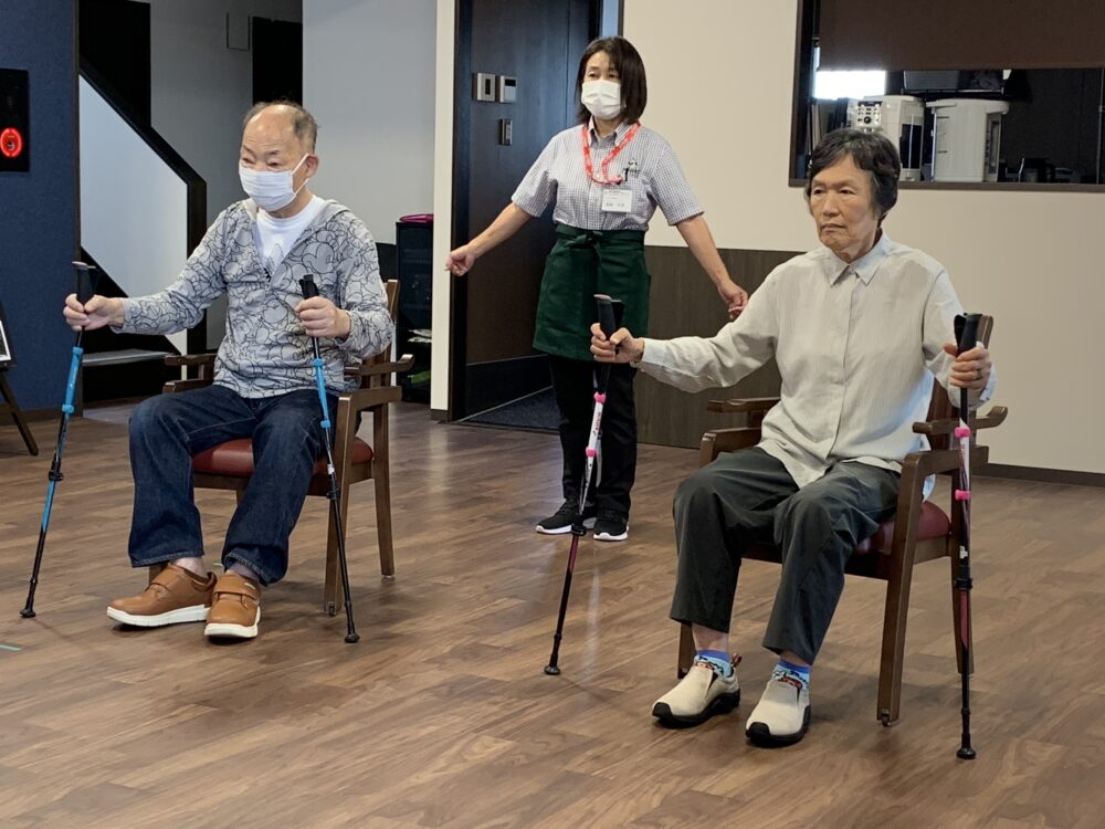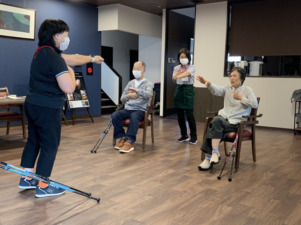 ノルディックを使って音楽や先生の動きに合わせてアクティブに動いていきます。