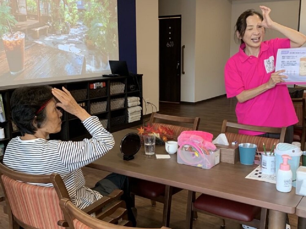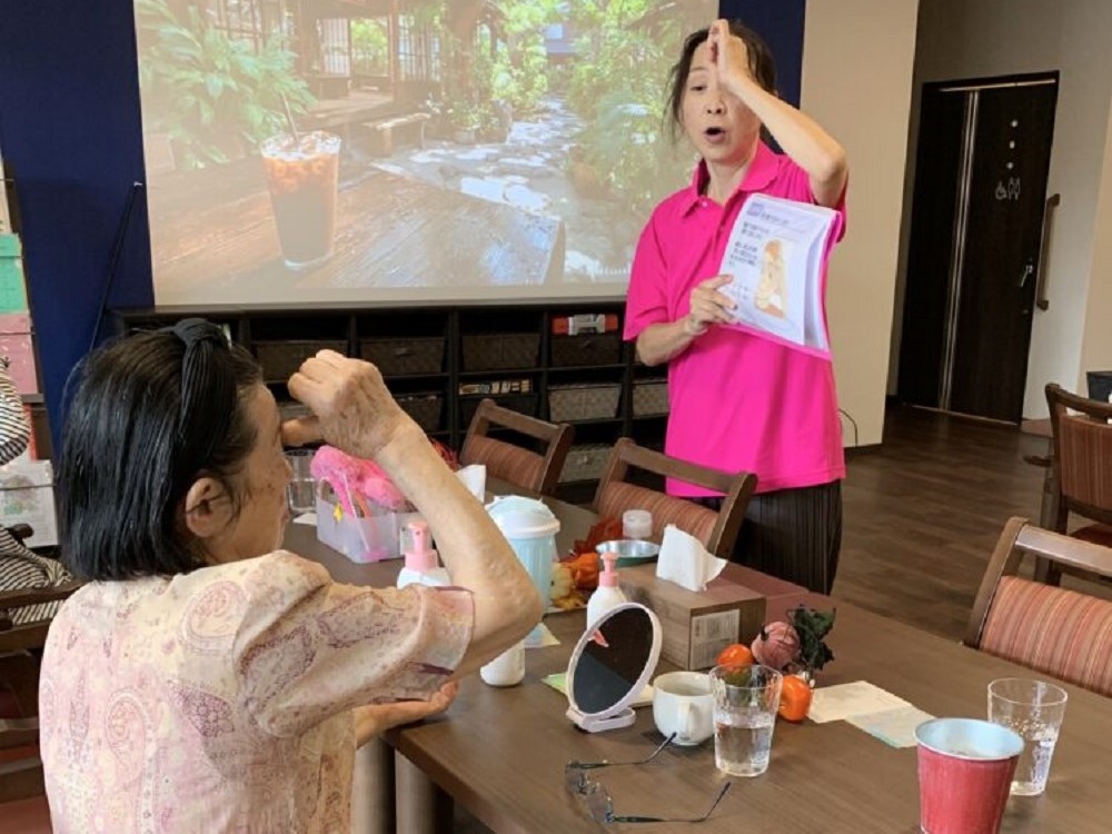 今回は初めに「小顔マッサージ」を実施。「気持ちがいいわね」と参加されていました。