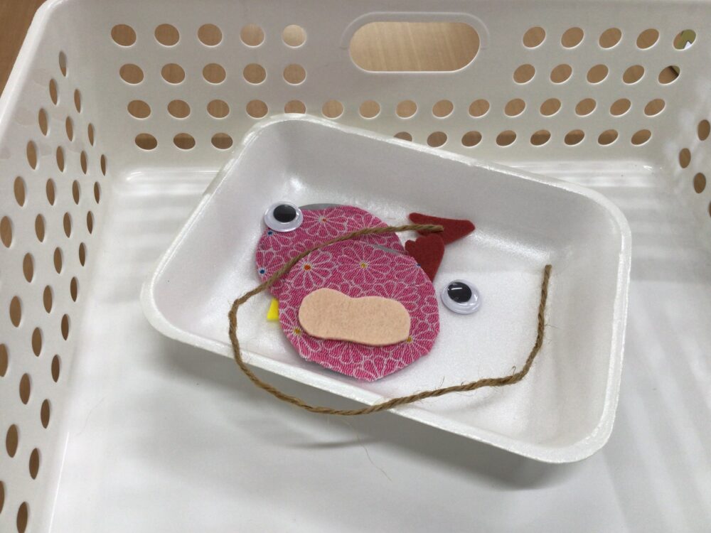 お客様には好きな柄の台紙を選んでいただき、目・くちばし・羽を貼り付け、台紙を2枚貼り付けて厚みを出して頂きました。完成するとすぐにカバンに取り付ける方もいらっしゃったり、またお客様により柄が違うので、見せ合ったりする様子が見られました。皆様大変喜んで下さいました。