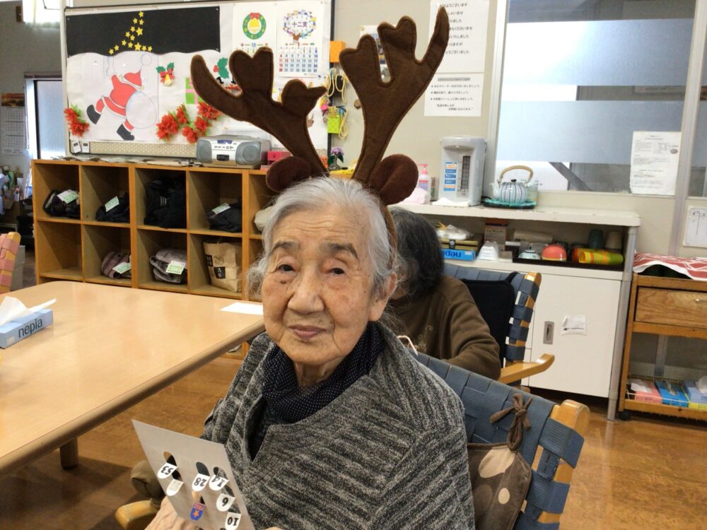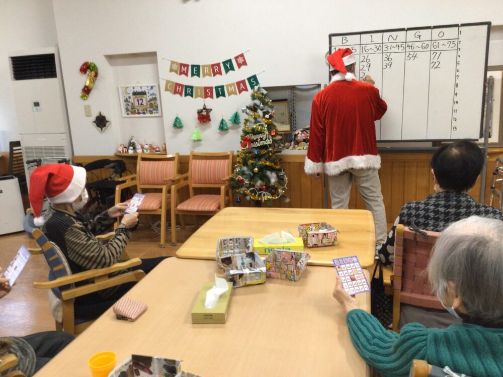 毎年恒例のクリスマス会。会までの期間わくわくソワソワしていただけたらと思い、会場の飾りつけは12月に入ってすぐ職員全員で行いました。その甲斐あってビンゴは盛り上がり、皆様の笑顔がたくさん見られました。小さいお子さんがいないご家庭では、ツリーを出したり、ケーキを食べたり、ということは段々となくなってきます。デイサービスに通っていただき、年末のイベントを楽しんでいただく、あるいは昔ご自身のお子様やお孫さんとすごしたクリスマスを思い出していただけたら幸いです。
