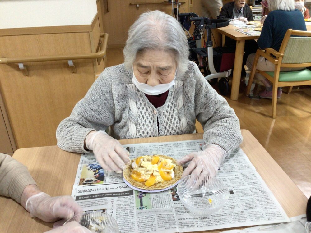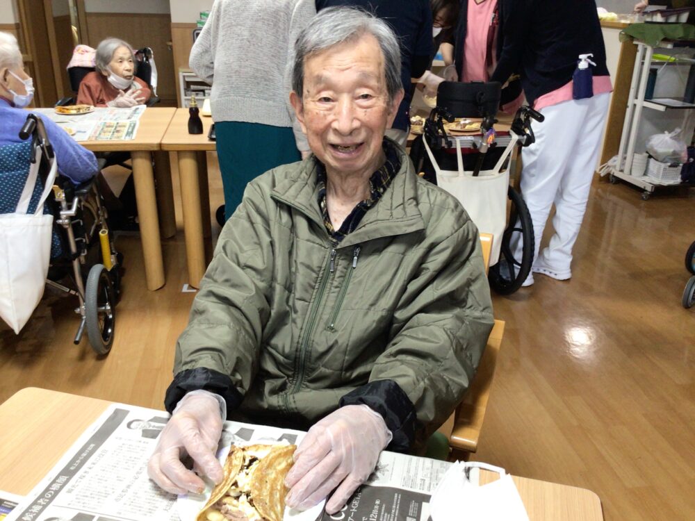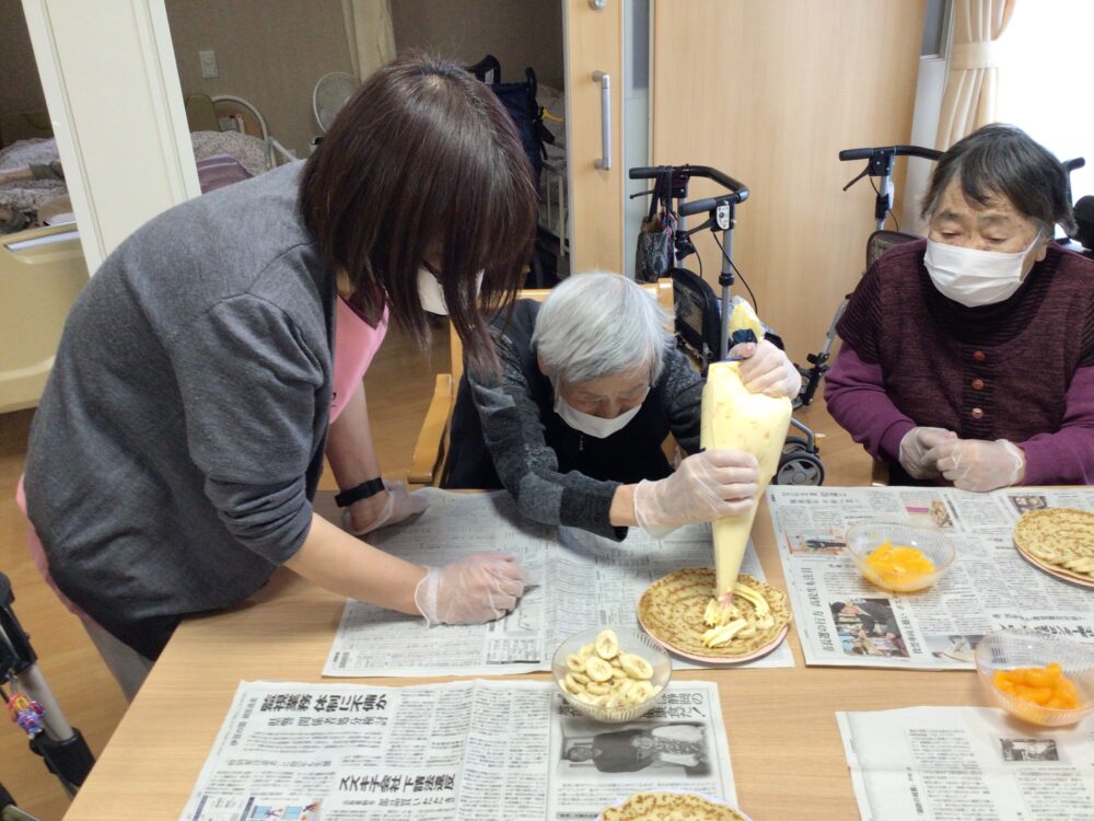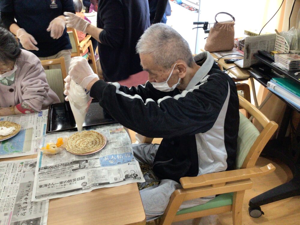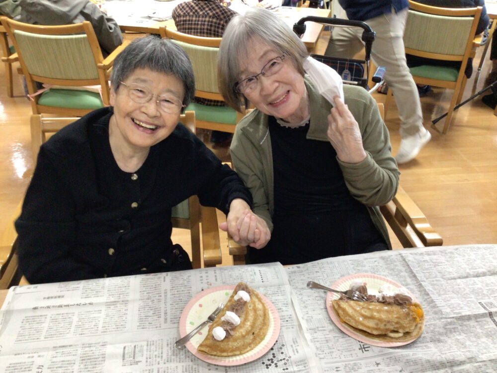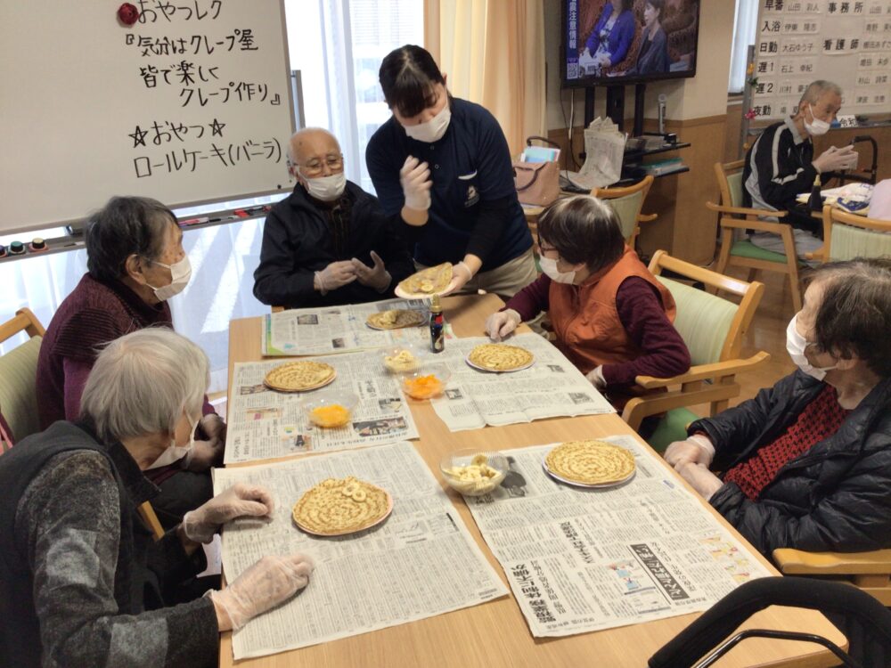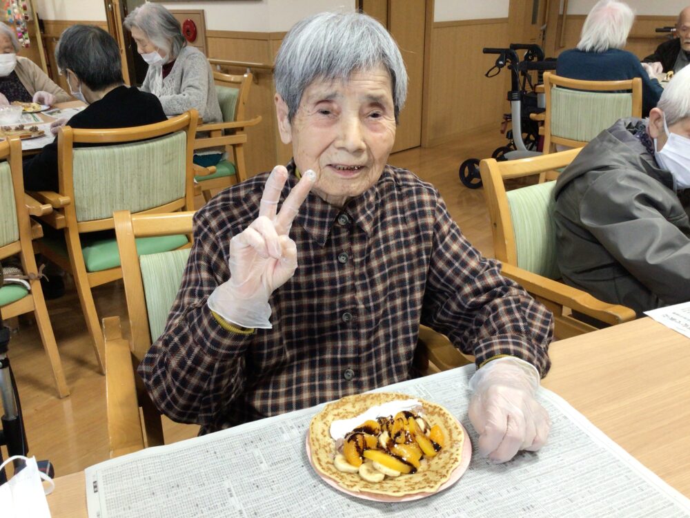 クレープは若い方には馴染みのある食べ物ですが、ご高齢の皆様には見た目や食感が新鮮だったようで大きな反響がありました。「美味しい」という声が多く、調理工程もシンプルで皆様参加出来るので、またアレンジを加えて実施したいと思います。若い人向けの食べ物という先入観を持たずに今後も様々なメニューに挑戦していきたいです。