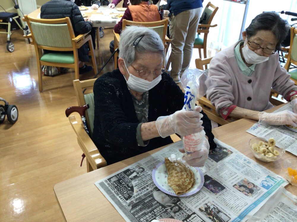 出来立てのクレープはそのままおやつとして提供させていただきました。ご自分でお好みの具材を乗せて作ったクレープということで皆様嬉しそうに召し上がられていました。
