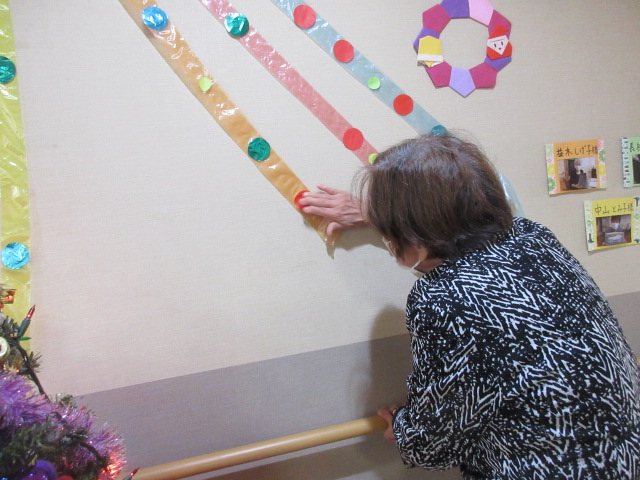 クリスマスパーティーの準備ということで、壁紙の作品を作成して頂き、貼り付け作業を行って頂きました。当日までにも皆様参加頂き、当日まで待ち遠し感じが伝わってきました。