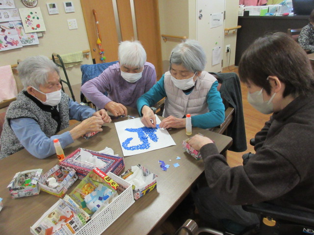 クリスマスイベントということで、皆様にはサンタとトナカイになった気分になって頂き、荷物をお届けするレクリエーションです。皆様机の上の色のついた場所と同じ色のリボンがついたプレゼントの袋を同じ色の場所に置くというレクリエーションで、脳トレにもなりますし、二人組で行った為、協力して行って頂きました。