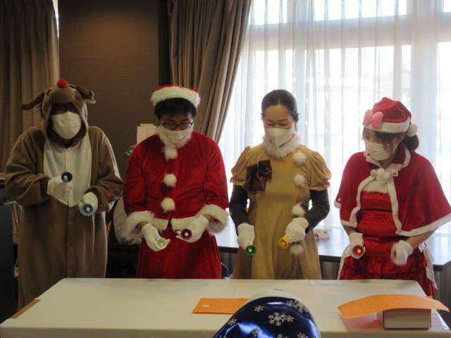 待ちに待ったクリスマスパーティー当日、皆様にもサンタの帽子を被って頂き、雰囲気を味わって頂きました。まず最初は職員のハンドベル演奏です。練習した成果を見せる時、と気合十分ですが、音が外れるようなハプニングもあり、皆様笑顔で見て頂き、後半は、お客様にもハンドベルを行って頂きました。