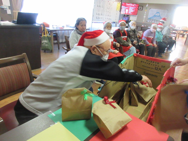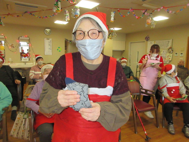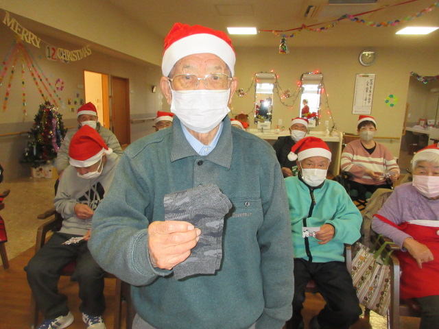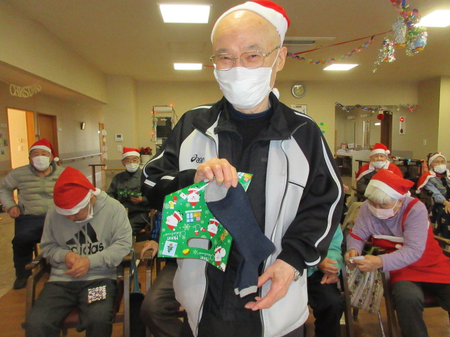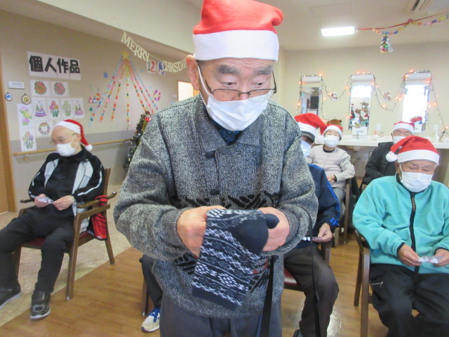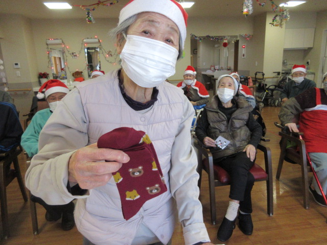 厚原デイクリスマス恒例のビンゴ大会を行いました。今年の賞品は、靴下でした。ビンゴになった方からお好きな柄を選んで頂きました。皆様嬉しそうにカメラに笑顔でプレゼントを見せて下さいました。