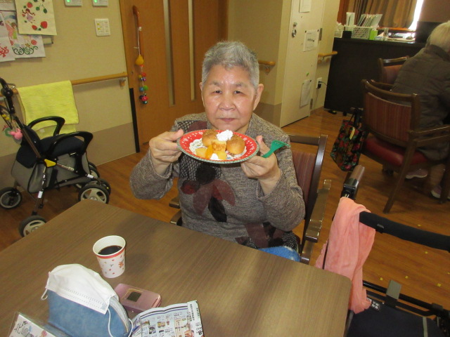 クリスマスケーキということで、今回はシュークリームとジュースを合わせて提供させて頂きました。皆様甘いシュークリームにほっぺたが落ちそうな表情で大満足されていました。皆様とても喜ばれていました。
