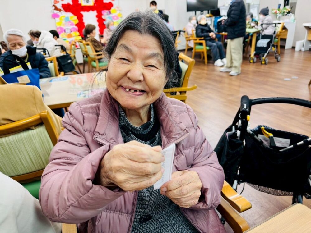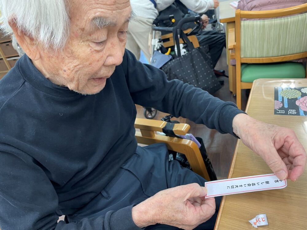 帰りの会で職員手作りのプチおみくじを引いて頂きました。「おみくじ、久しぶりに引くよ。ちょっと緊張。」と、ワクワクされているご様子。