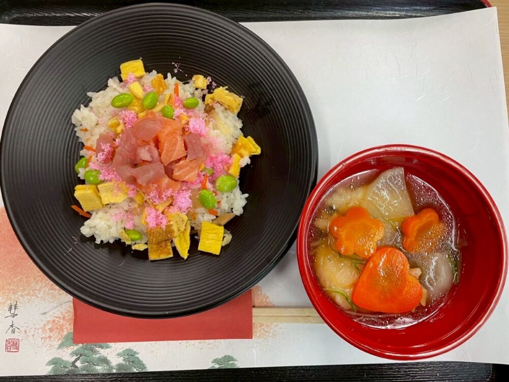 彩りが美しいちらし寿司と、すいとん入りのお雑煮が完成しました!