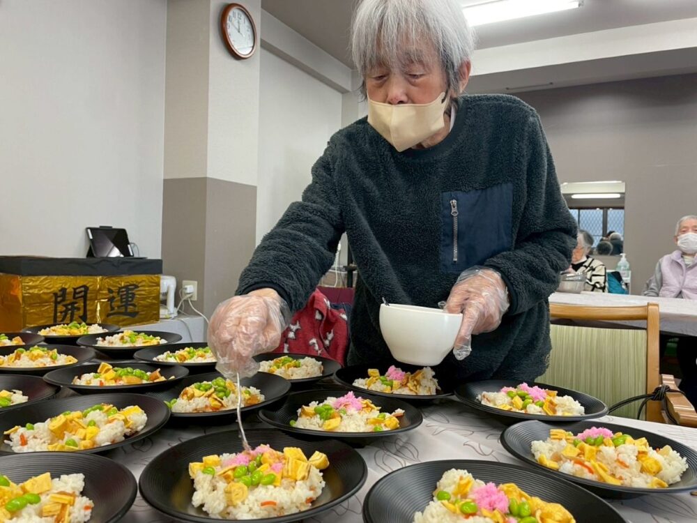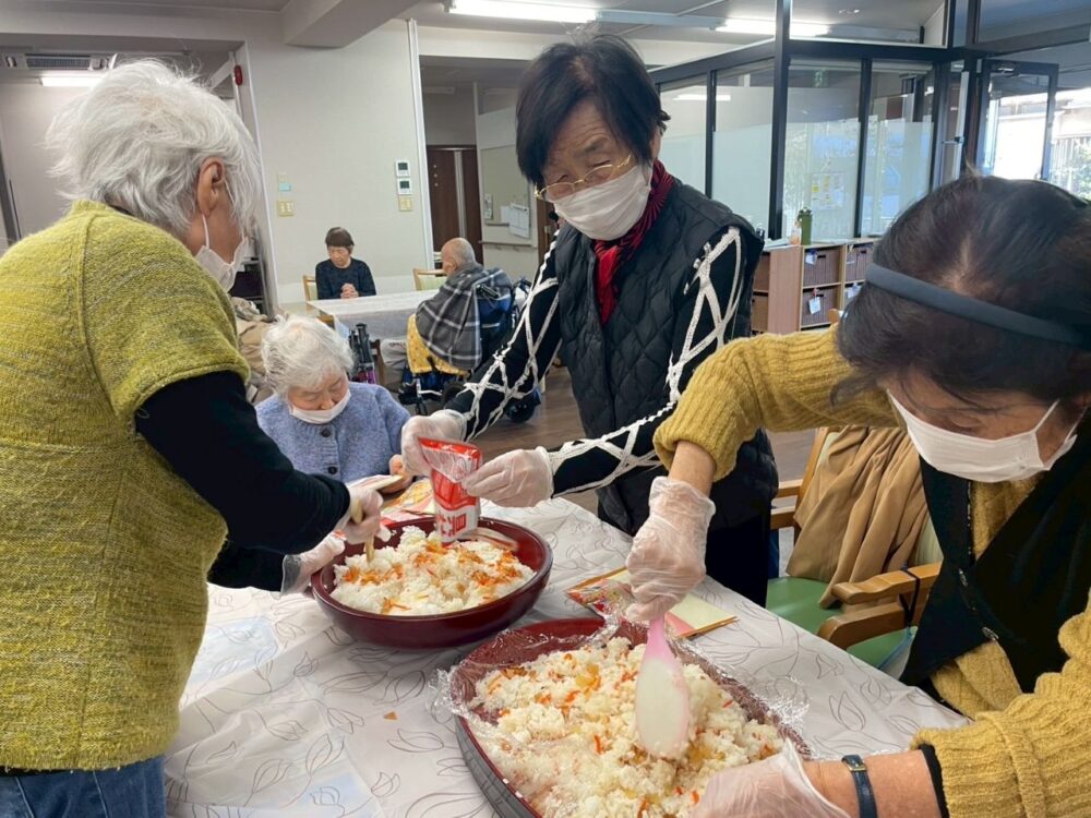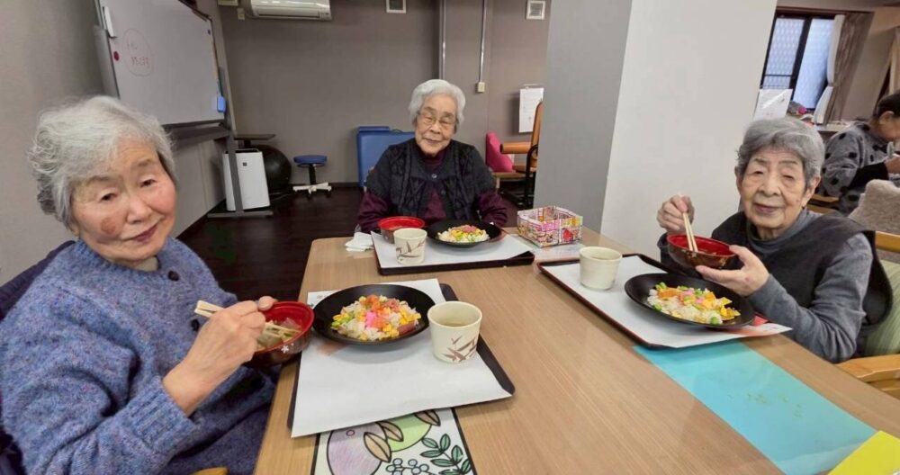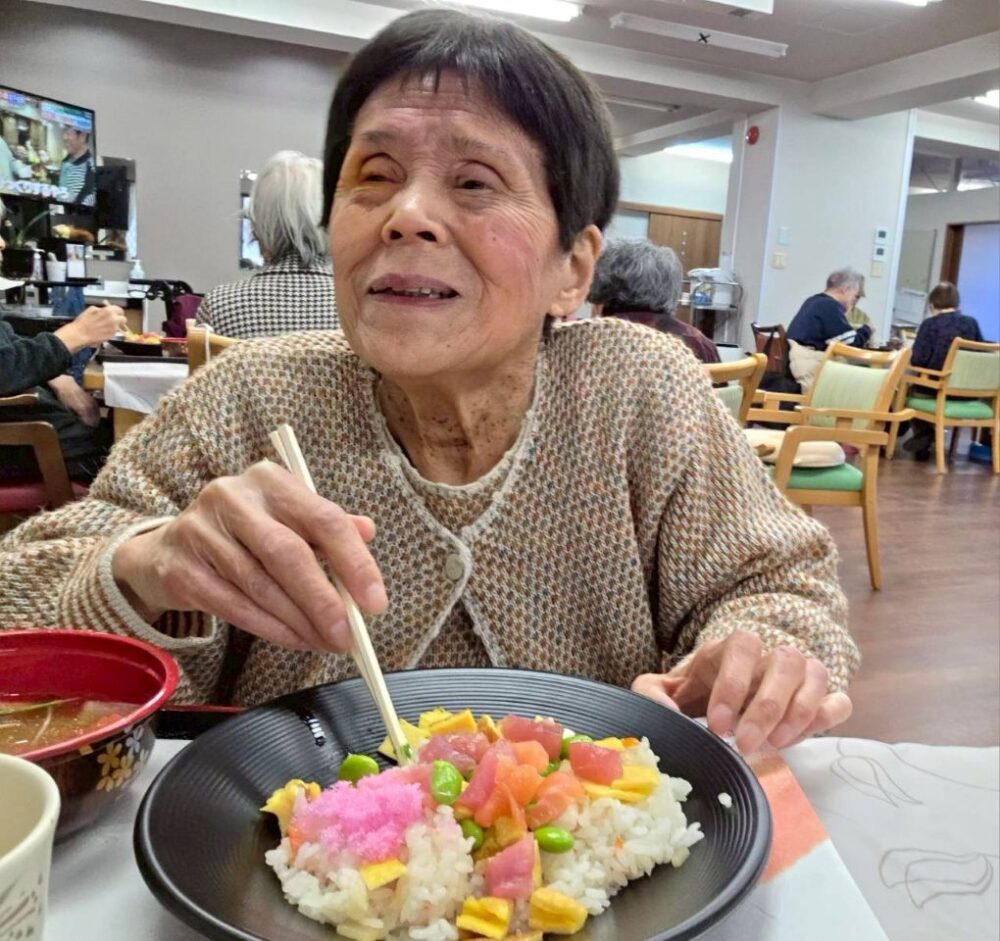 「ちらし寿司の酢飯が丁度いい味付けで美味しいよ~」「ほんと?良かった~!喜んでもらえて嬉しいよ」という会話も聞こえてきました。皆様で協力して作ったので尚おいしいですね!