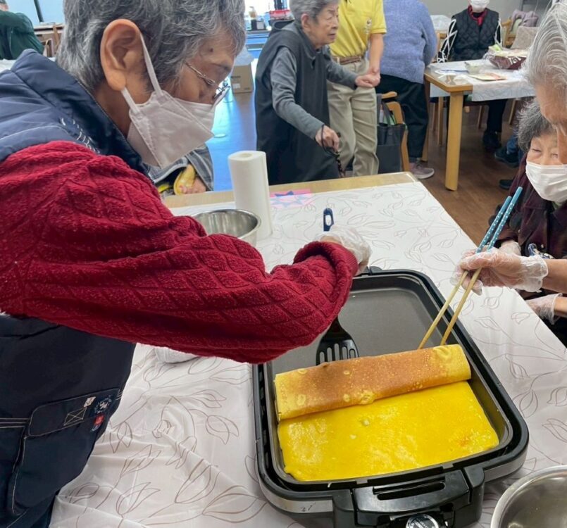 一方、ちらし寿司チームはホットプレートで大きな玉子焼きを調理中。「甘めの玉子焼きにしよう!」と、味付けにもこだわり何度も味見をして味の調整をされておりました。